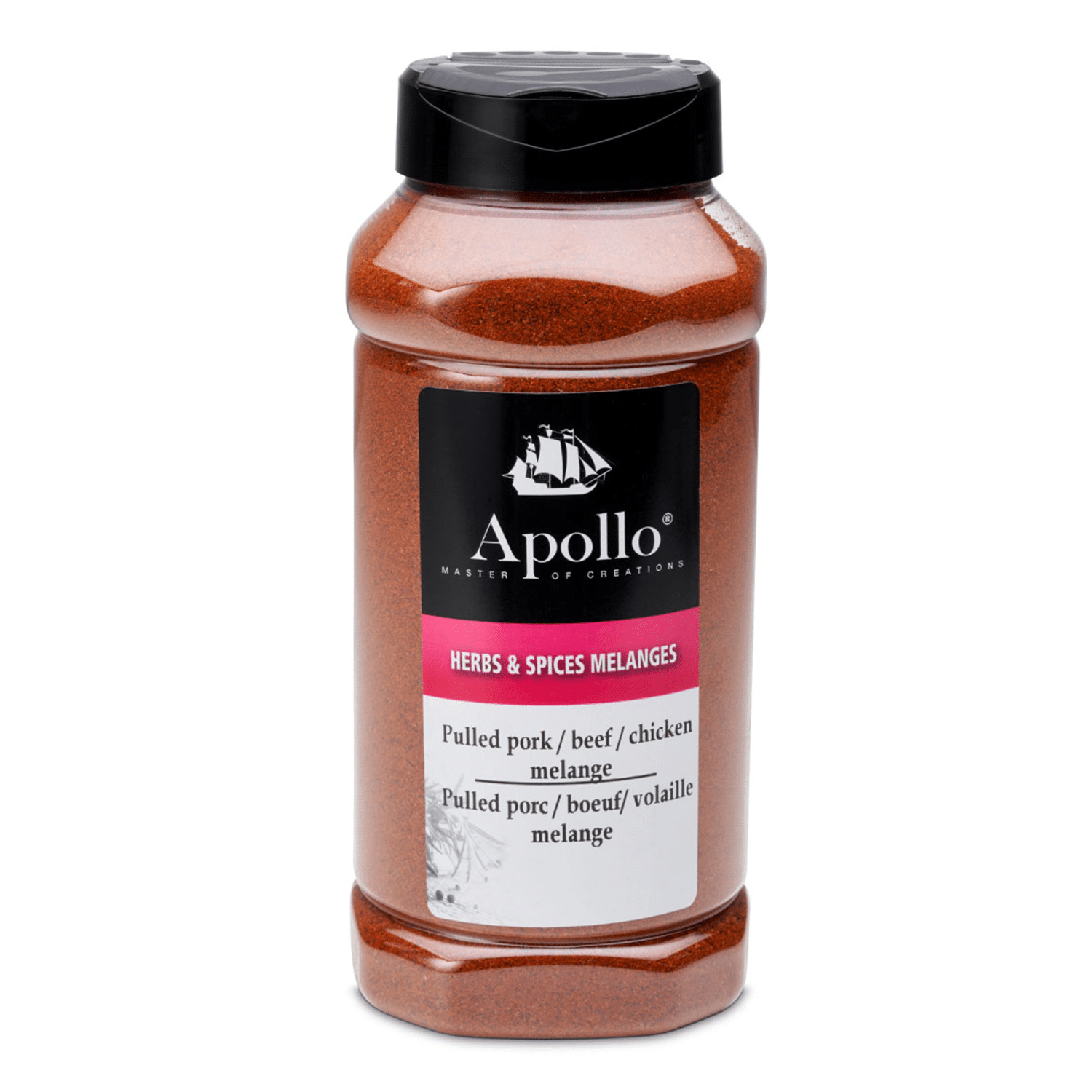 Condimentulpulled pork / vită / pui de la Apollo este un amestec de condimente cu o aromă ușoară de fum, ideal pentru condimentarea cărnii de porc, pui și carne de vită.