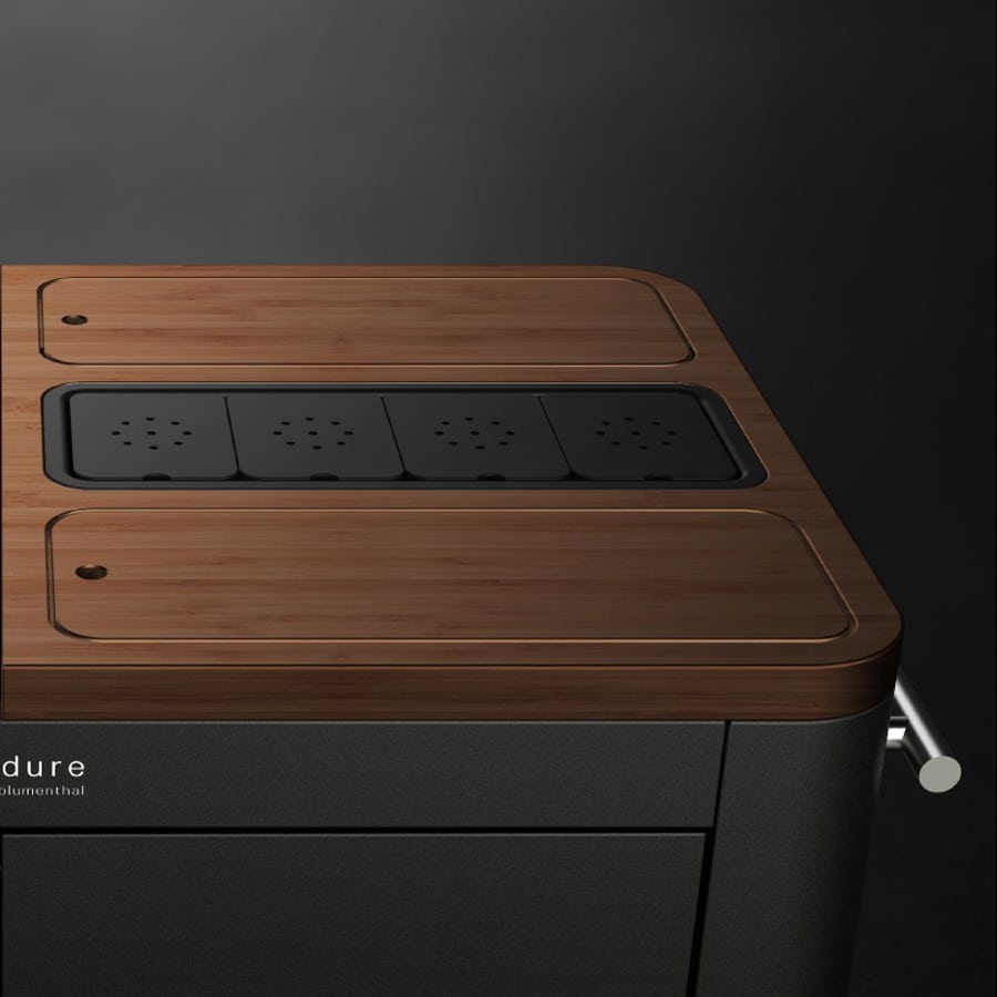 Capacele acestor containere pot fi folosite ca suprafață pentru o planșă robustă pentru brânzeturi și gustări. La marginea exterioară posterioară a blatului de lucru există loc pentru a depozita 5 cuțite de bucătărie și de tăiere în blocul de cuțite destinat. Folosiți cele patru recipiente mici pentru a vă depozita ierburile și condimentele. Aceste recipiente sunt chiar detașabile, creând un compartiment mai mare pe care îl puteți folosi după cum doriți. Un coș de gunoi rabatabil este atașat la partea laterală a bucătăriei Prep Kitchen. Barele de pe lateral, cu ajutorul cărora Bucătăria Prep este ușor de mutat, servesc și ca loc de agățat pentru uneltele dvs. de bucătărie.