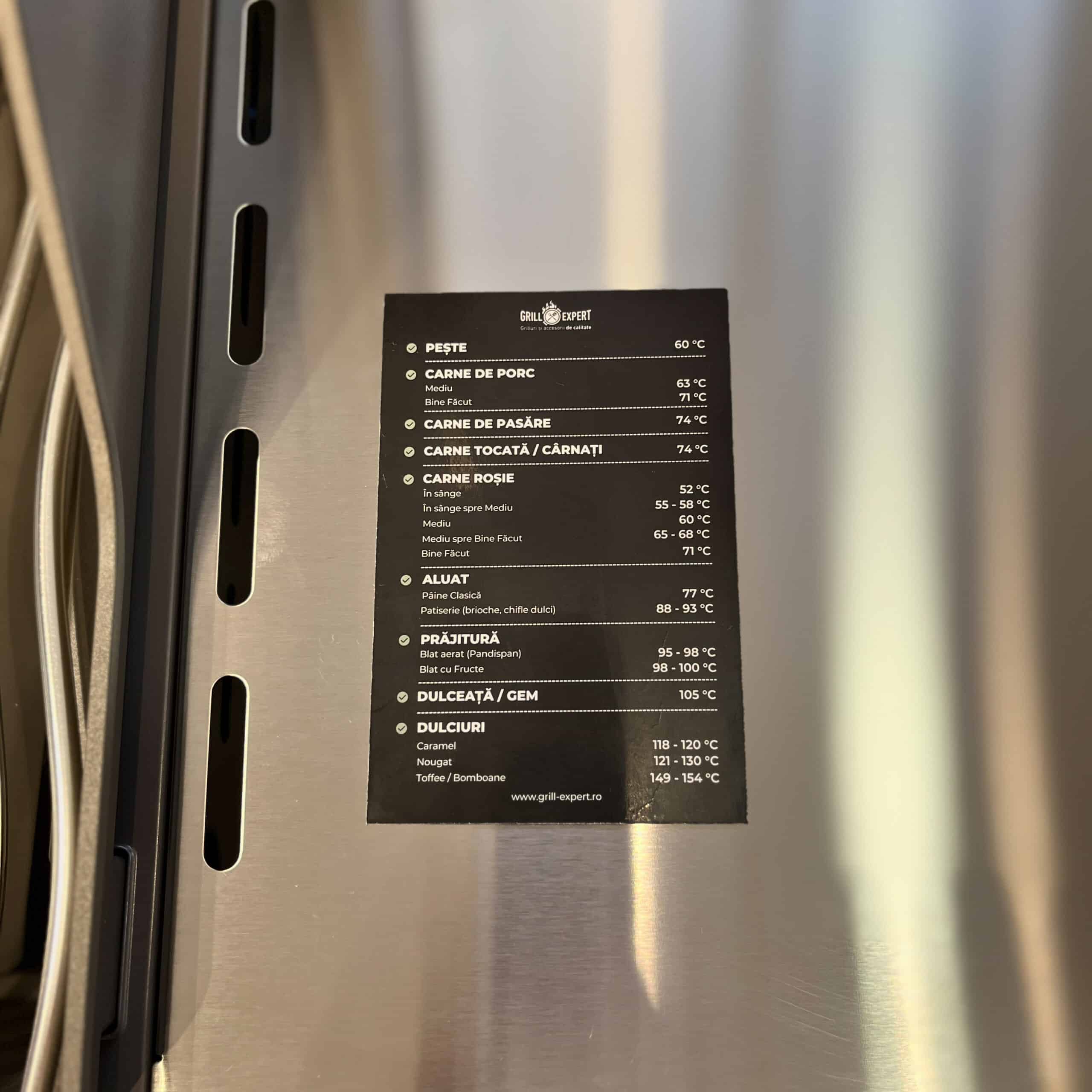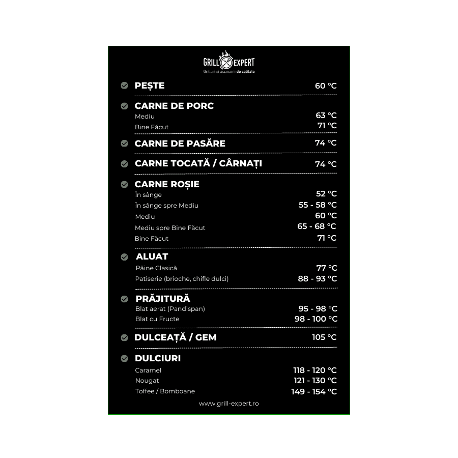 Acest ghid de temperaturi magnetic Grill Expert de frigider la îndemână prezintă temperaturile recomandate de bucătari. Pentru carne, pește, păsări de curte, coacere și cofetărie.