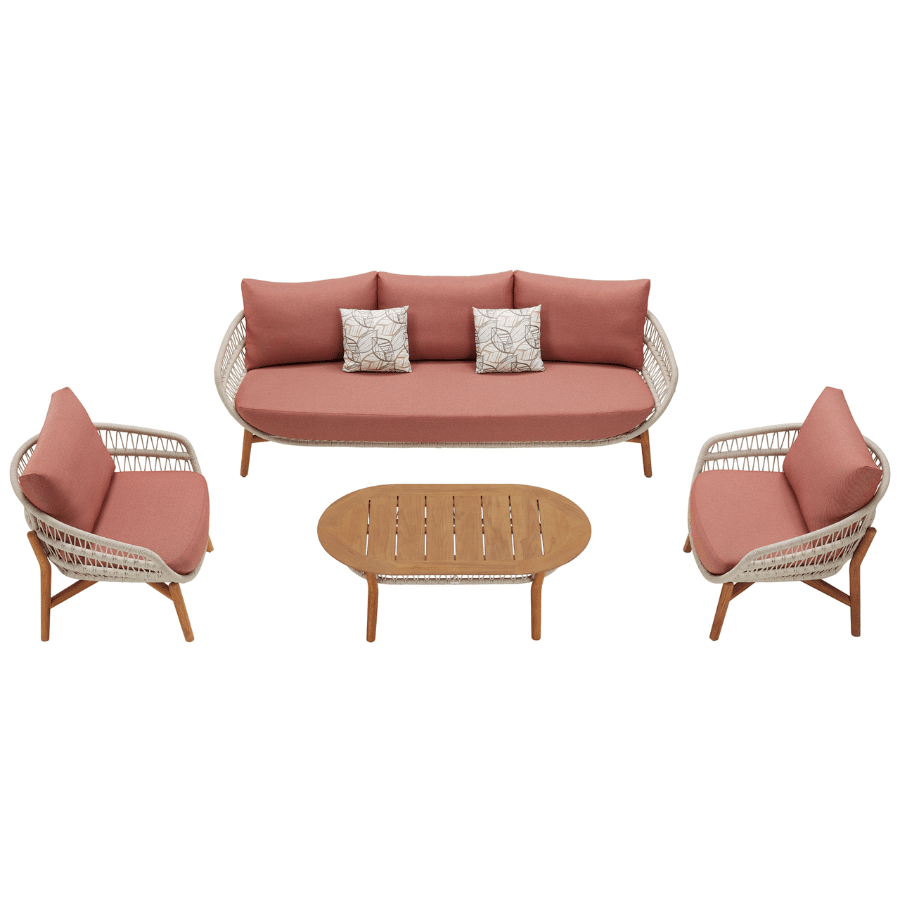 Setul de mobilier Higold Vasca include o canapea cu trei locuri, doua fotolii, si o masuta de cafea. Cadrul mobilierului este realizat dintr-o combinatie inedita al lemnului de tec cu franghie sintetica rezistenta si deosebita si cu aspect frumos. Pernele de sezut si de spatar sunt deosebit de groase si confortabile si sunt realizate din spuma de inalta densitate, cu huse din olefin de calitate superioara, rezistente si placute la atingere. Sezutul fotoliilor si al canapelei este proiectat astfel incat sa fie putin mai inalt in fata si mai jos in spate pentru a oferi suport mai bun genunchilor si pentru a impiedica alunecarea pernelor de sezut in fata.
