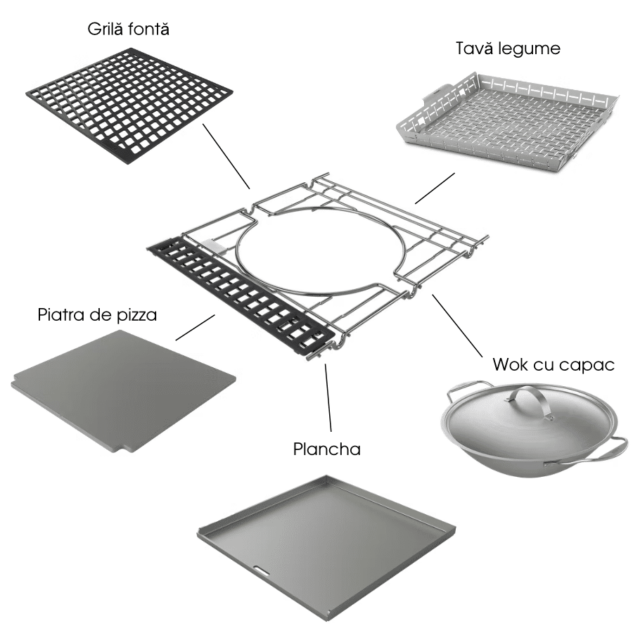 Rafturile laterale au cârlige de care puteți agăța accesoriile pentru grătar, cum ar fi cleștele, spatula pentru grătar sau peria pentru curățat. Astfel, aveți întotdeauna la îndemână accesoriile pentru grătar și completați bucătăria de grătar în aer liber. Fiecare masă laterală are câte 3 cîrlige pentru ustensilele de gătit.