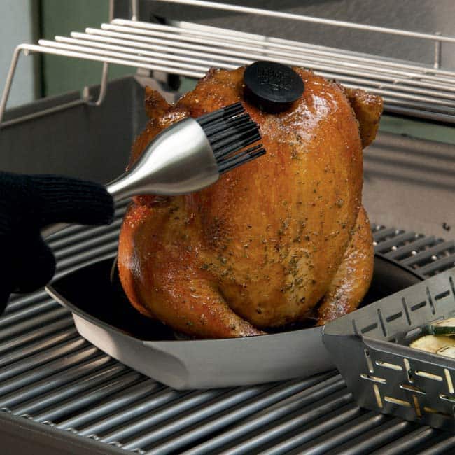 Rotisor de pui – rotisorul fix de la Weber este ideal pentru pregătirea puiului perfect rumenit la cuptor sau la grătarul cu capac. Acest model de rotisor fix este compus dintr-o tavă de prajire anti-lipire prevazută cu suport pentru lichide, un infuzor și un dop care să mențină carnea hidratată în timpul preparării la grătar sau cuptor.