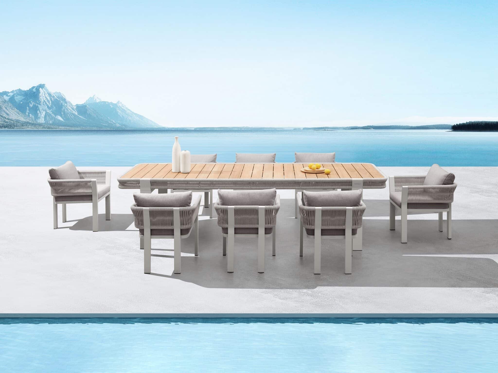 Colectia Borromeo include set cu canapea si fotolii, set de coltar cu masuta de cafea, sezlonguri si set de masa cu scaune, toate potrivite pentru gradini sau terase private, precum si pentru restaurante sau hoteluri. Acest set dining pentru 8 persoane include o masa de dimensiuni generoase, si 8 scaune confortabile cu cotiera si perne groase.