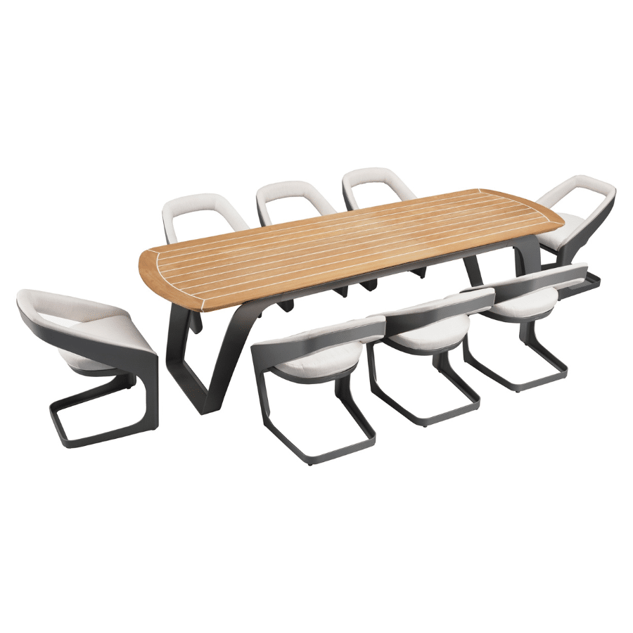Setul include o masa realizata dintr-o placa de aluminiu de 8 mm cu durabilitate ridicata, cu blat din lemn de tec, completat de opt scaune confortabile tapitate cu tesatura tip Sunbrella. Masa este usor de curatat si nu necesita tratamente speciale de intretinere. Setul de mobilier de gradina ONDA este o alegere excelenta pentru terase moderne, spatii hoteliere si comerciale.