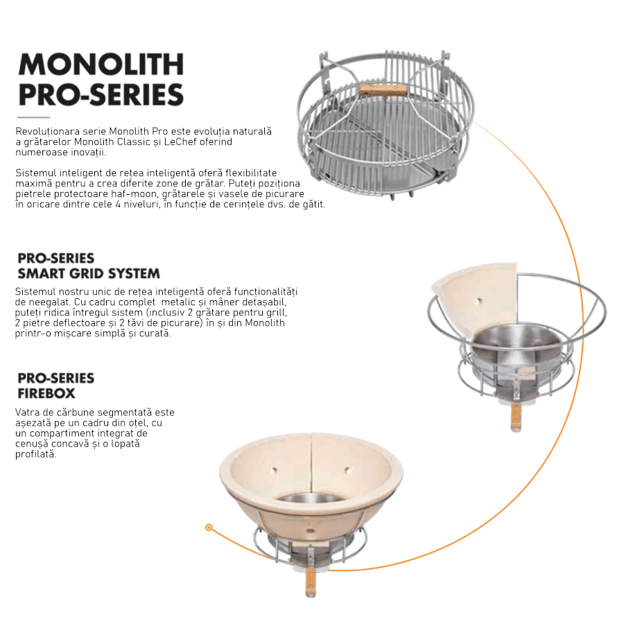 Față de alte grătare ceramice, Monolith se deosebește prin design și circulația redusă a aerului care previne uscarea cărnii și îi păstrează suculența; în plus, este dotat cu un sistem de încărcare cu talaș/rumeguș/peleți de afumare pentru a conferi cărnii un gust delicios de BBQ, fără a fi nevoie să ridicați capacul grătarului! Monolith ajută la obținerea unor experiențe de neuitat.