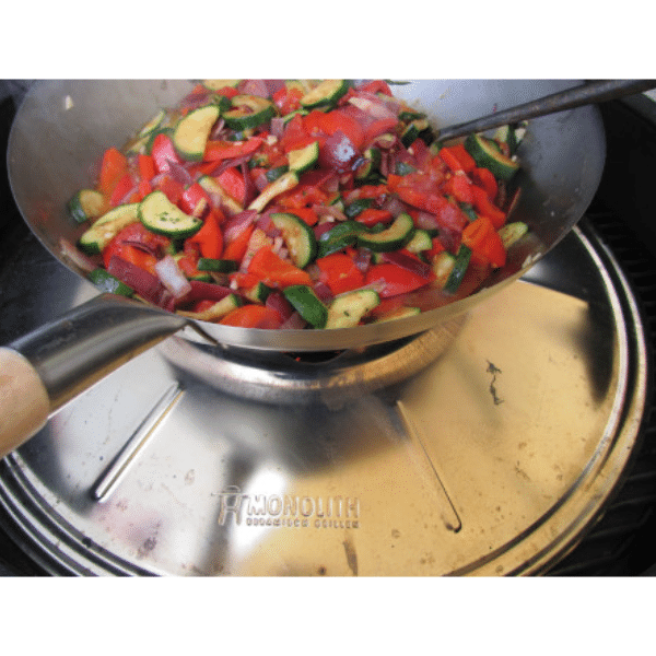 Suportul wok din oțel inoxidabil este un suport robust care permite un mediu sigur și convenabil pentru a vă folosi wok-ul pe grătarul Monolith LeChef pentru a găti delicioasele preparate asiatice și nu numai.