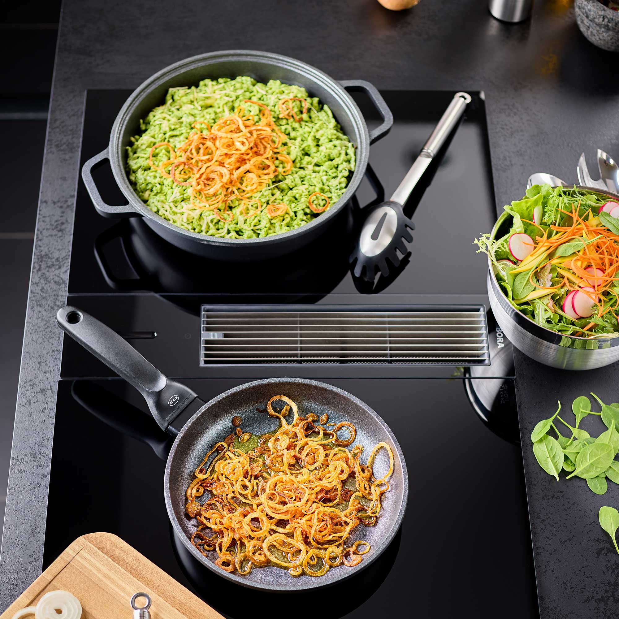 Tigaie Cadini de la ROSLE convinge prin greutatea valoroasă și stratul antiaderent de înaltă calitate ProResist, care garantează o curățare sigură și permite utilizarea ajutoarelor de bucătărie din oțel inoxidabil.